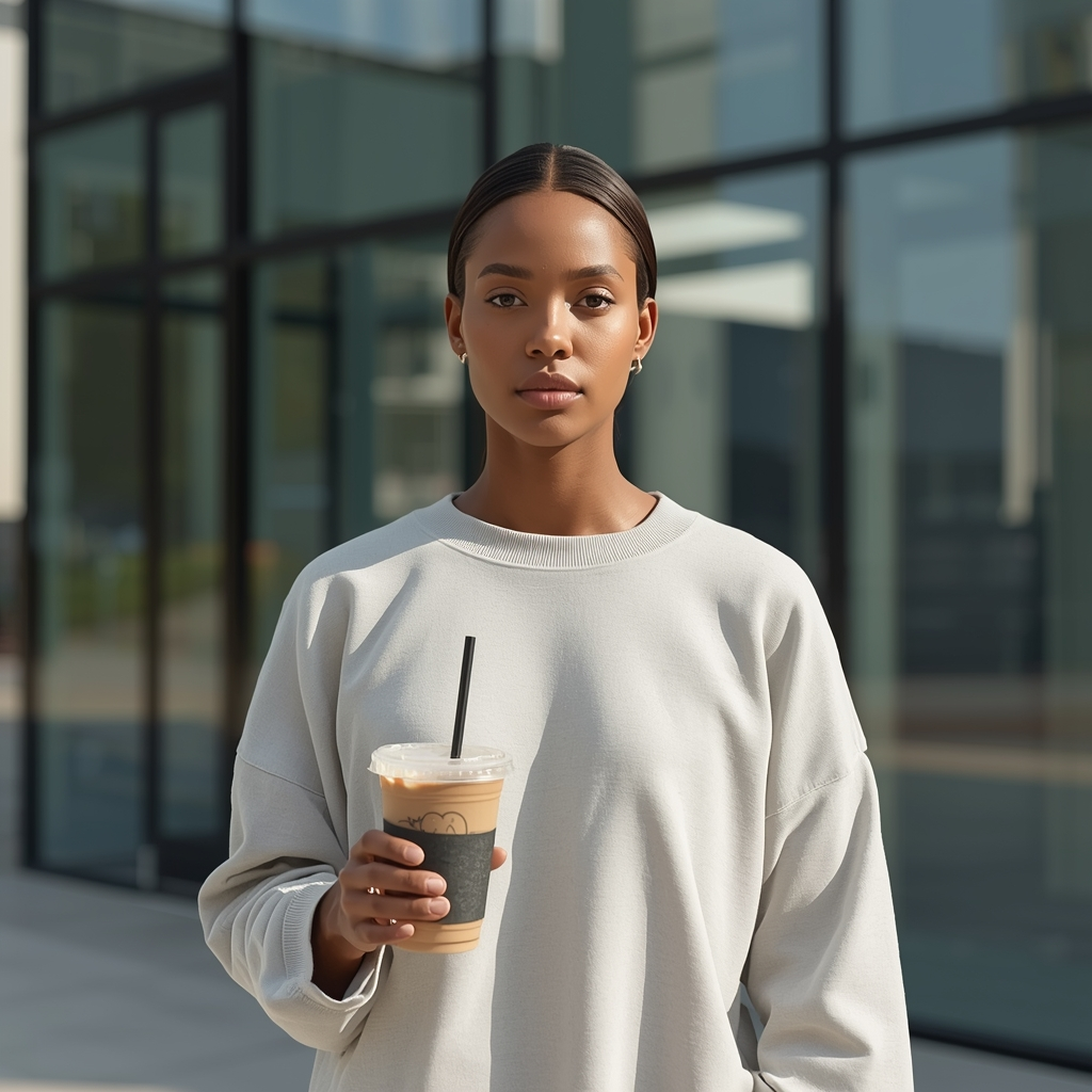 Clean urban portrait in front of modern glass architecture, soft daylight, oversized sweatshirt styling, iced coffee prop, minimalist fashion vibe, high-detail 8K realism.