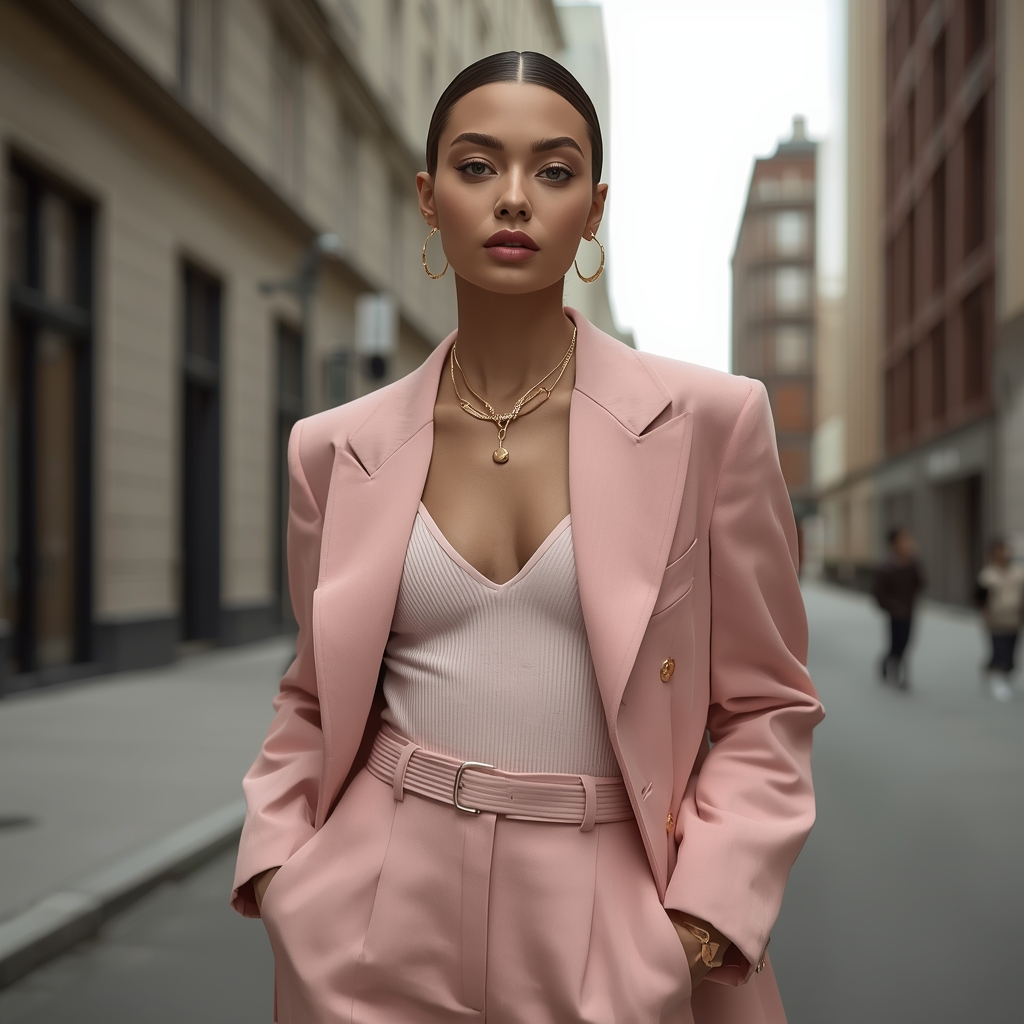 Sophisticated urban fashion portrait, monochrome pink outfit, minimal gold jewelry, confident stance, balanced natural light, luxury editorial look, ultra-realistic 8K output.